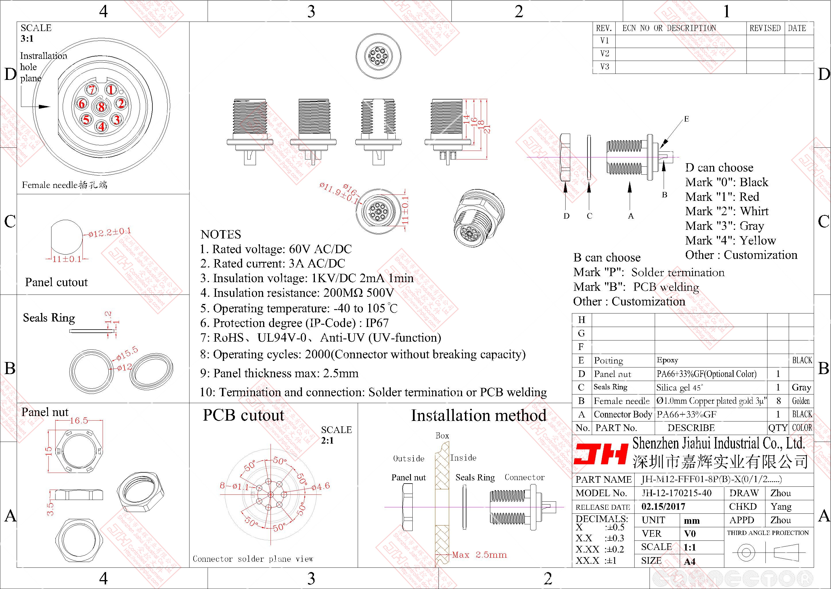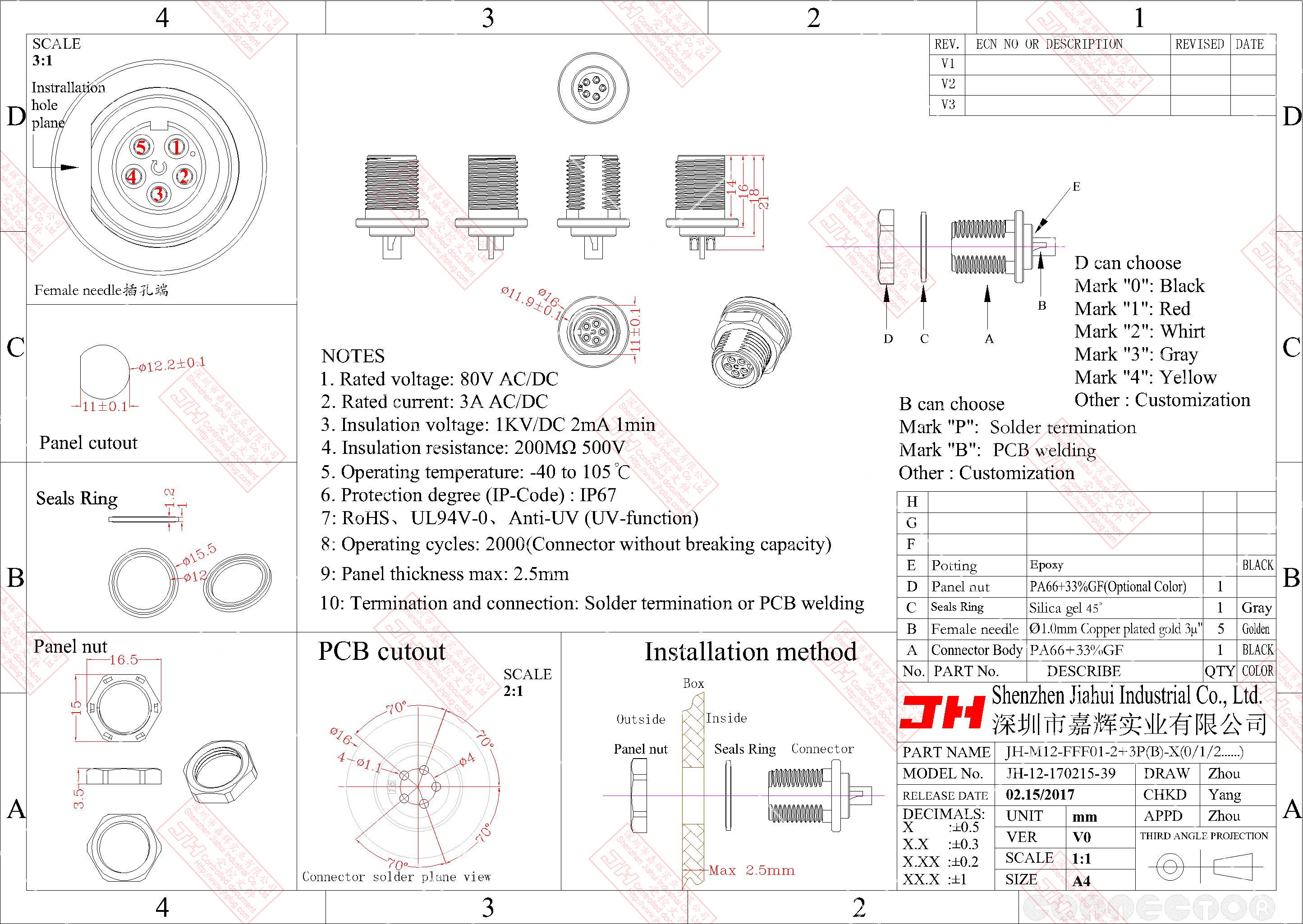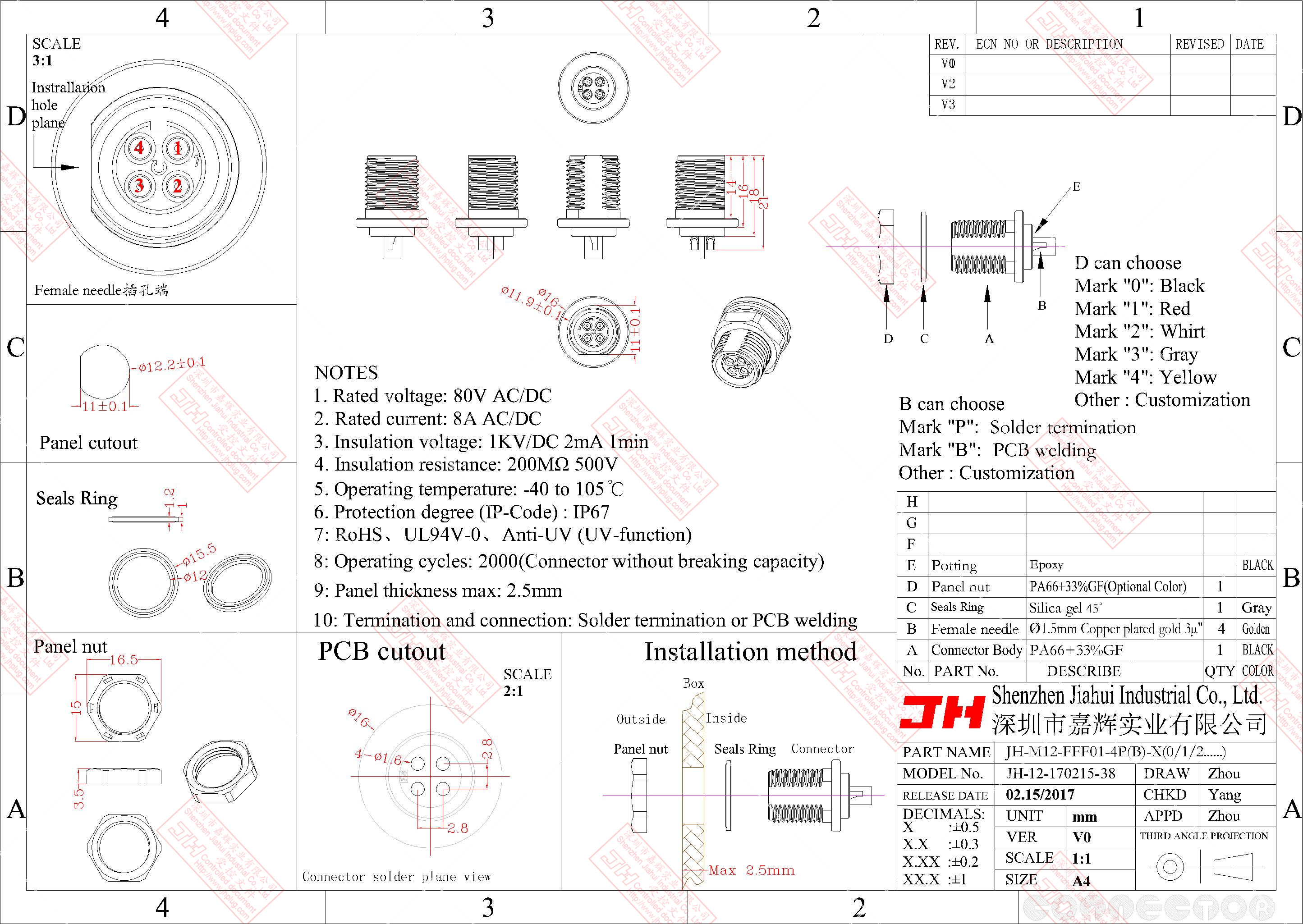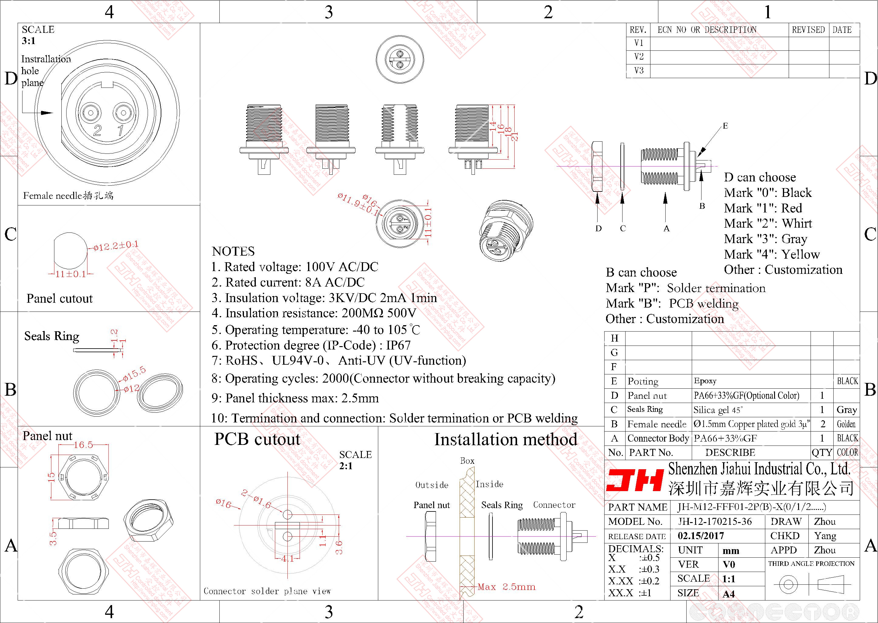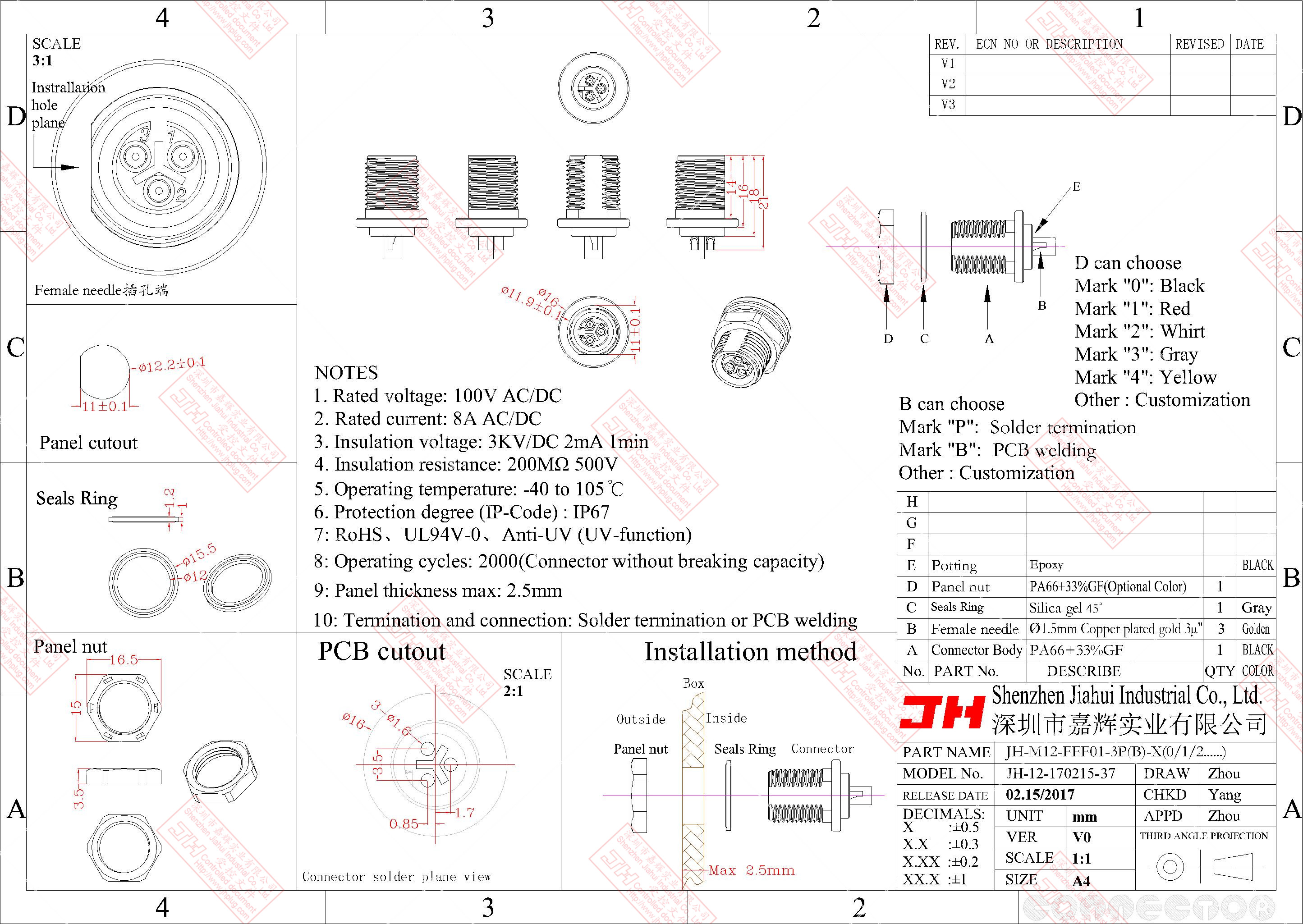 4、Standard M12 ×1.0 international thread design , Panel cutout 12mm, Panel thickness max.:2.5mm.